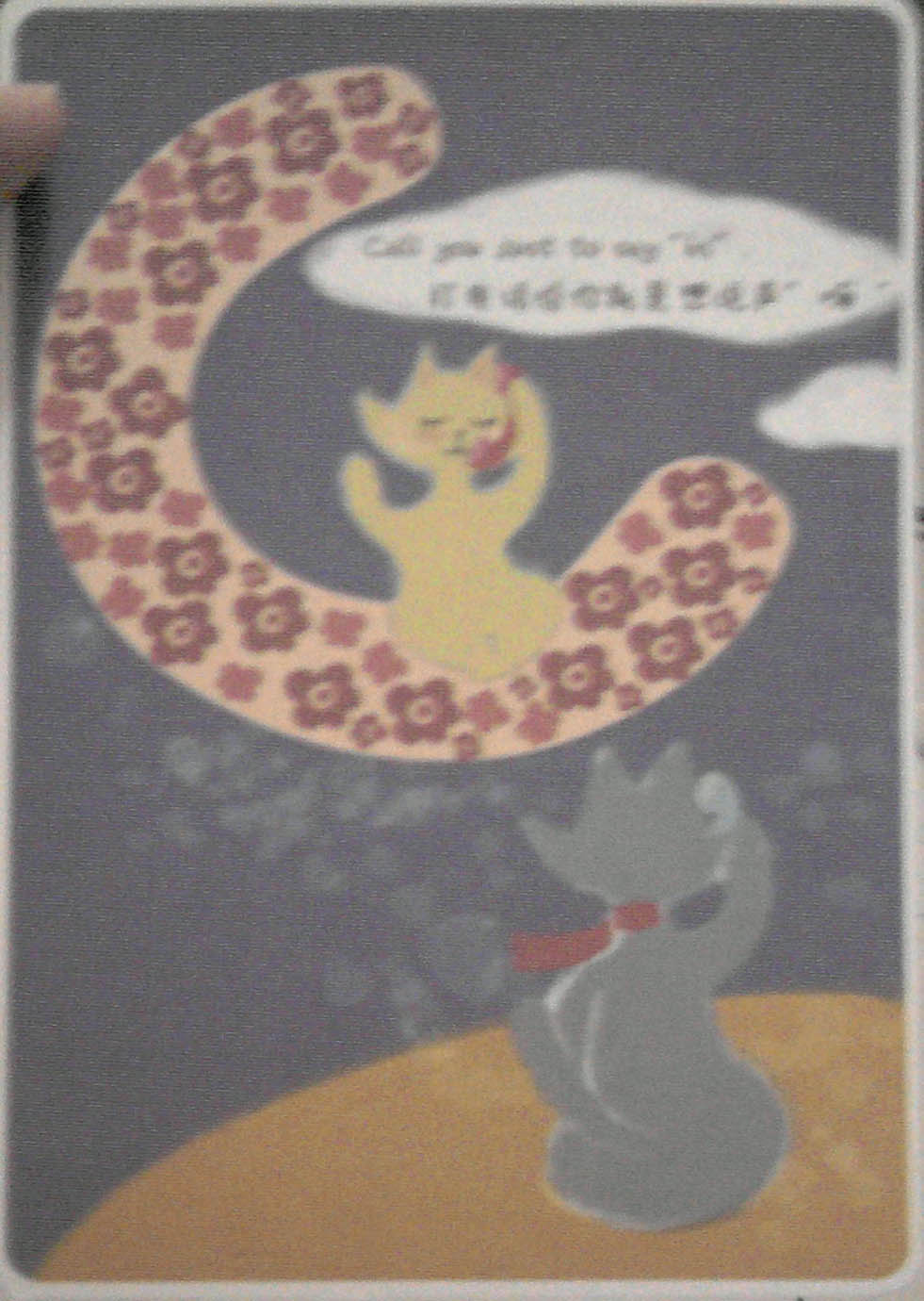 某個周末,和好友駕車去一個古鎮(zhèn)游玩,在一個專門出售漂亮卡片和本子的小店挑揀,打算買些小卡片送人。偶然看到卡片上一對小貓,小黃貓坐在月牙上,握著紅色電話,跟小灰貓通話,邊上寫著一句——“打電話給你就是想說聲‘嗨’。”